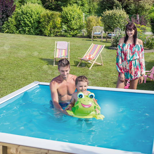 Incluye un almacén bajo la superficie para guardar los elementos de piscina como robot de piscina, accesorios de limpieza y mantenimiento, y juguetes de agua.